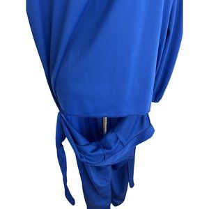 blue polyester one piece jumpsuit with a wrap waist/ zip front closure
