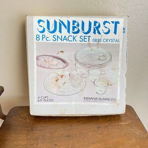 In box Sunburst #0853 crystal 8pc snack set by Indiana Glass Co. Includes 4 cups and 4 - 9" plates. Plates have raised circle to keep cup stable. Sunburst design is on bottom of plate.