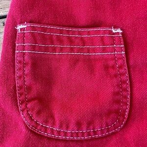 Vintage In Design Kids Frog Alligator Friends Overall Shortalls. Kids size 24 months. Red with embroidery on the bib. Good preowned condition with light wash wear/fade. It is missing a snap at the crotch, but still closes fine. Would be an easy fix but not necessary.