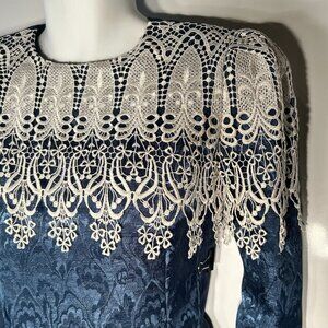 Vintage In The Mood SZ 8 Teal Satin Brocade Crochet Cape Collar Midi Dress 80's Dressy Flattering