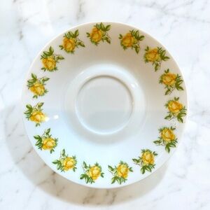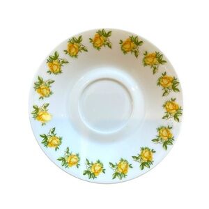 Elegant saucer featuring a charming floral design in yellow roses and green accent. Perfect for adding a touch of elegance nature to your dining experience. Start or add to your vintage collection. Measures 5”.