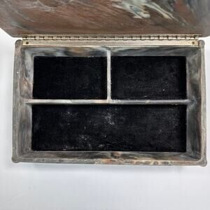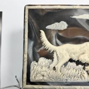 Beautiful vintage Incolay stone jewelry box featuring a detailed raised relief of a hunting dog with flying birds and wild grass. Rich marbled brown, black, and ivory tones with deep bas-relief carving. Hinged lid opens to a divided black velvet-lined interior. Marked © Incolay on the back. Ideal for rustic lodge, Western, or sporting decor. Excellent vintage condition with some surface wear consistent with age. Please review pictures for details.