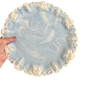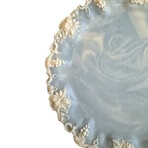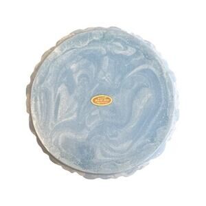 Excellent preowned vintage condition. This is a beautiful powder blue Incolay Stone plate or platter that is marbled and color and has gorgeous white grapes, and grape leaves for the trim around the scalloped edges. This is a bisque piece. The underside is glossy. What a perfect piece for any decor. Measures approximately 11 1/2 inches in diameter.