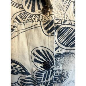 Stunning vintage button-up from India Boutique. Crafted from 100% cotton and made in India, this long-sleeve shirt features metal buttons, a striking black geometric and floral print on a warm beige base. Details include a classic collar, chest pocket, and button front. Pattern includes intentional fading- this is not wear.