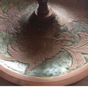 This is a fantastic candle holder that was Made in India. I think it is brass but it has a copper look to the metal from beautiful natural patina. It is gorgeously etched with flowers and leaves with green inlay. It is so gorgeous in person....the photo does not do it justice. Great vintage condition with patina for character. Measures 5.5" diameter and 5" tall.