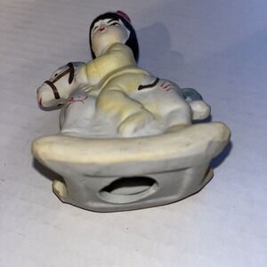 This exquisite vintage bisque figurine depicts an Indian boy riding a pony. The intricate details of the figurine highlight the unique character, featuring a medium complexion and black, no-hair doll. The doll is an original and licensed reproduction from the 1940s, and is set to delight collectors of antique and vintage dolls.