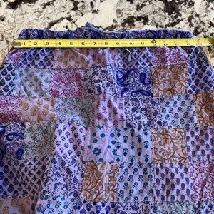 Super charming block print patchwork skirt with drawstring waist. Hidden side Velcro pocket. Vintage but excellent condition. Size small but runs big. Made in India 100% cotton.