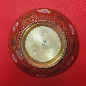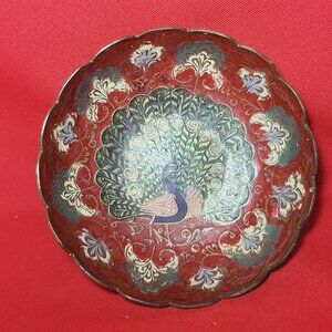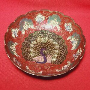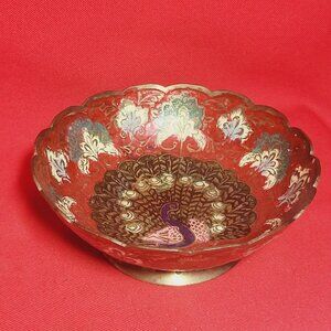 Vintage Indian Etched Brass Metal Peacock Pedestal Red Bowl Trinket Dish