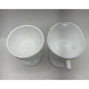 This is a vintage milk glass creamer and sugar bowl set in the Harvest Grape pattern, made by Indiana Glass for the Lancaster Colony line.