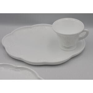 Charming vintage Indiana Colony milk glass snack set featuring the delightful Harvest Grape pattern. This set includes 2 tray and a 2 matching cup, perfect for adding a touch of vintage elegance to your tea time or snack presentation.