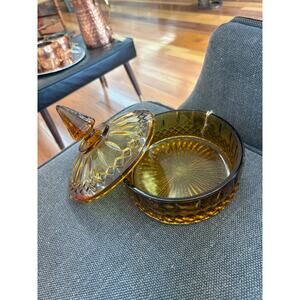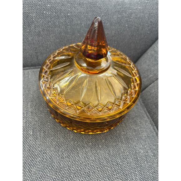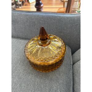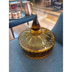 Vintage Indiana Glass Amber Gold Diamond Princess Covered Candy Dish w/ Lid