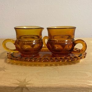 Vintage Amber Indiana Glass Thumbprint Creamer and Sugar with Tray