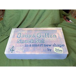 Add a touch of vintage charm to your dining experience with this 8 piece Daisy & Button Snack Set from Indiana Glass. The set includes a cup and plate for four guests. The plates are an unusual triangular shape with gently rounded corners and a slightly raised circle on the face to give a secure resting place for the cup while socializing. Its upper surface of the plate is smooth, allowing you to see the pattern through the clear glass. The underside features an ornate cut pattern of tightly packed geometric daisy and round button designs. The glasses, in contrast, do not have any decorations on them which just keeps the focus on the plates. The final product is truly visually stunning! These are all stored in the original box and are in wonderful vintage condition. No chips, cracks or other imperfections noticed on any of the pieces except a minor inclusion inside one of the cups.