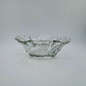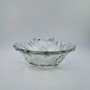 The Vintage Indiana Glass Clear Wild Rose 4 1/2" Handled Berry Bowl is a charming piece of retro kitchen decor. Made in America by the Indiana Glass brand, this round bowl features a classic clear glass material with a vintage Wild Rose pattern. Perfect for serving berries or other desserts, this bowl is a unique addition to any adult's department collection. Its pressed glass production style adds to its appeal, making it a collectible item that should be hand washed for maintenance.