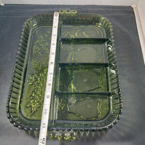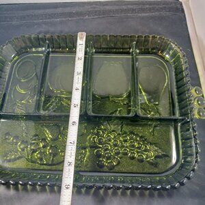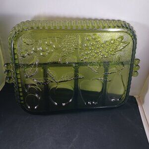 Excellent used clean condition. No chip no crack. Please scroll picture for more details. Vintage Indiana Glass Co. Serving Tray of Green Glass/Fruit Sectional Platter. Pet and smoke free home.