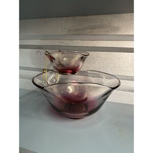 Vintage Indiana Glass Cranberry Chip & Dip Bowl Set w/ Metal Bracket Mid Century