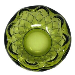 Vintage Indiana Avocado Olive Green Glass Duette Crimped Rose Bowl with Atomic Starburst Pattern.