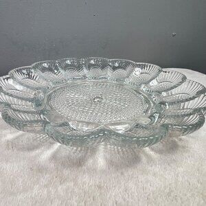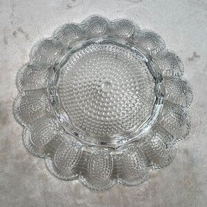 Vintage Indiana Glass deviled egg plate in clear heavy duty glass. Hobnail design, scalloped edge, nice size for party, holidays, etc. Approx 11-1/4" across. Good condition, no chips or cracks.