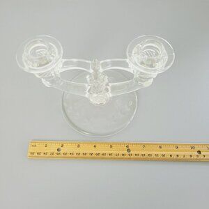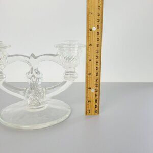 This Vintage Glass Double Candle Holder, crafted by Indiana Glass circa 1939-47, features an intricately etched floral design. With its clear glass material, it adds an elegant touch to any table setting or home decor.