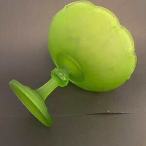 The bowl is in good condition, with some minor manufacturing flaws on the stem knobs and hairline scratches from previous use, which are typical for a piece of this age. These small imperfections add to its vintage character and authenticity. The vibrant green color and pedestal base make this piece perfect for displaying fruit, serving at special occasions, or as a striking centerpiece.