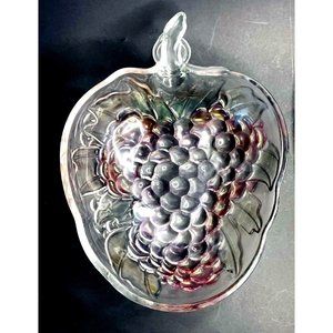 Vintage Indiana Glass Grape Cluster Bowl 13" (stem to tip) x 9.5" (side rim to rim) x 3.25" Deep beautiful grape shaped fruit bowl with a stem and embossed grape cluster on the back There is an Iridescent Purple-Pink color that shows in the glass and changes as the light hits the glass. It is in excellent condition with no cracks or chips.