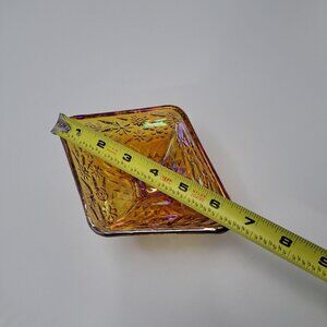 This vintage Indiana Glass dish features a radiant marigold hue with intricate floral designs. Perfect for storing candies or small trinkets elegantly.