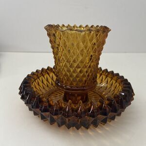Vintage Indiana Glass fused Diamond Point Votive Peg Candle Holder w Base Amber