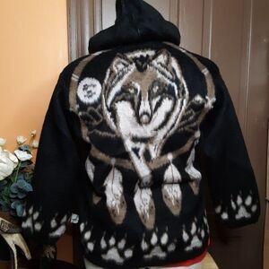 Excellent condition. All Indians Native Wear Brand 100% Wool Wolf Motif Women Jacket size M. Great for outdoor,hunting,fishing, hiking. Super Warm. Pet and smoke free home.