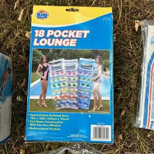 Lot of vintage inflatable pool floats and beach toys, many still sealed in original packaging. Brands include Intex, Wet Set, and others. Assortment features classic 80s/90s styles: lounges, rafts, inflatable chairs, and beach balls. Bright retro packaging with colorful graphics — perfect for display, poolside décor, photo shoots, or collectors of vintage summer items. Some packages show light storage wear but contents are unused/sealed. Please see photos for all included items and exact condition. Rare chance to grab a nostalgic bundle of pool floats and toys from a past era!