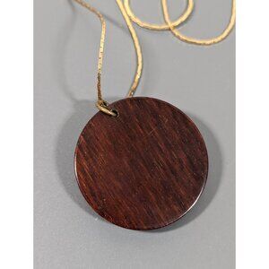 Vintage Initial Letter E Brown Wood Round Pendant Necklace Gold Tone 18 in