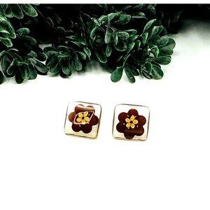 Elegant square earrings featuring intricate inlay with a delicate yellow flower design, encased in clear resin. Designed for the professional woman who appreciates subtle, artisan-crafted accessories that blend natural materials with contemporary style.