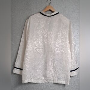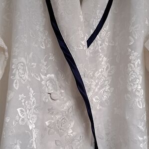 excellent condition, has shoulder pads that can easily be removed, collar, neckline & cuffs are trimmed in blue, beautiful pearl white 100% polyester fabrication, pit to pit 27" sleeve 23" length 28.5", made to be loose fitting