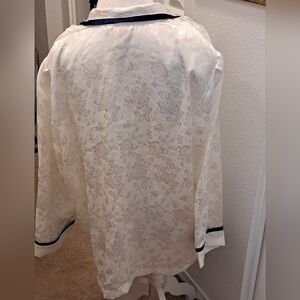 excellent condition, has shoulder pads that can easily be removed, collar, neckline & cuffs are trimmed in blue, beautiful pearl white 100% polyester fabrication, pit to pit 27" sleeve 23" length 28.5", made to be loose fitting