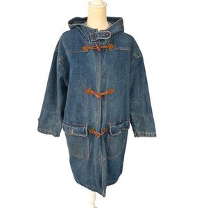 This denim duffle coat features toggle closures and a functional plaid lining, combining practicality with classic style. Designed for comfortable everyday wear.