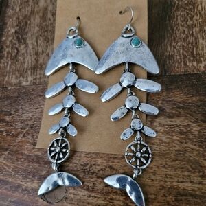 Vintage Inspired Boho Fish Bone Dangle Earrings With Turquoise Accents