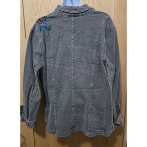 In a world where denim meets floral, this jacket tells a story of stylish resilience. Embroidered blooms on classic denim create a tapestry of nature and fashion. Its button closure offers a timeless vibe, making it a versatile piece for your wardrobe. A delicate dance of colors unfolds against the sturdy fabric.