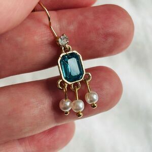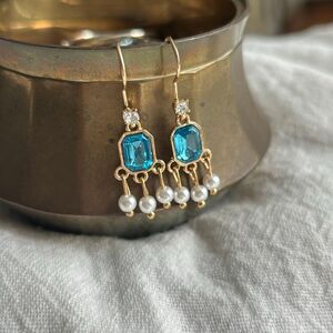 Vintage Inspired Gold Blue Stone Pearl Dangle Earrings
