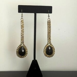 Pre owned in excellent used condition. A pair of long, elegant dangle earrings The earrings feature a vertical column of small, square, gold-toned metal links leading to a large teardrop-shaped black gemstone at the bottom. The black gemstones are faceted, adding a subtle shine, and are bordered by a decorative gold-toned frame that complements the chain. The overall style is vintage-inspired, combining classic gold and black for a bold yet sophisticated look-perfect for formal or evening wear.
