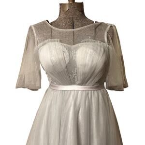 Romantic vintage-inspired light gray tulle dress, perfect for bridal, prom, or formal wear. Features a structured bodice with lace detail, sheer illusion neckline, and flutter sleeves. The lace-up corset back allows for an adjustable fit, while the tea-length layered tulle skirt creates a dreamy, ethereal silhouette.