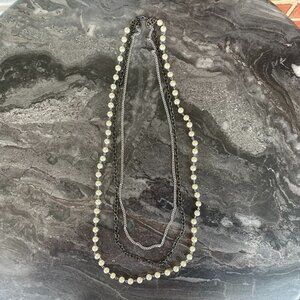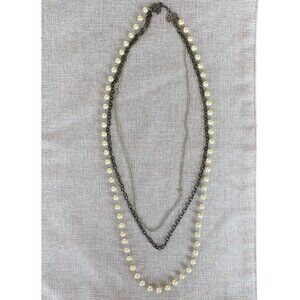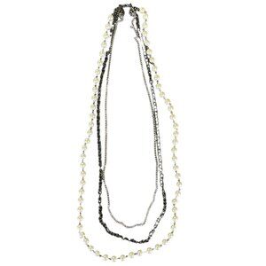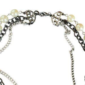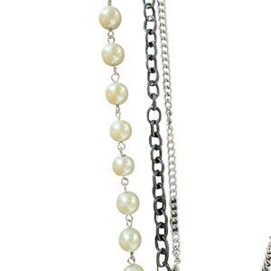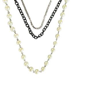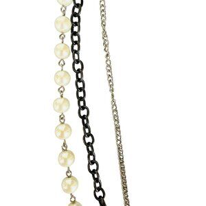 This necklace exudes timeless elegance with its vintage-inspired design. The combination of faux pearls and contrasting metal chains creates a beautiful layered effect. Perfect for adding a touch of sophistication to any outfit, it complements both casual and formal attire seamlessly.
