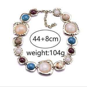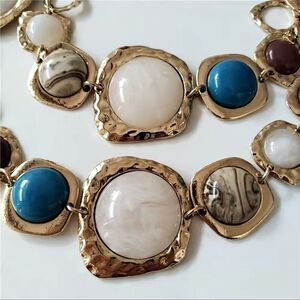 Add a touch of elegance to your wardrobe with this stunning matching necklace and bracelet set. Crafted with a mix of earthy-toned stones and set in a gold-tone frame, this set embodies both sophistication and artistic charm. The hammered metal detail around each stone adds a rustic, artisanal feel, making this set perfect for bohemian or vintage-inspired looks.