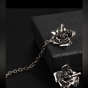 Vintage Inspired Rose Sweater, Collar, Or Blazer Pin with attached chain. Light-Medium Weight with gorgeous silver color and engraved design. Perfect for any occasion! 🖤