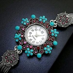 This stunning vintage-style bracelet watch combines elegance with intricate craftsmanship. Featuring a silver-tone metal band adorned with red and turquoise gemstones, this quartz timepiece blends functionality with a touch of antique charm. The floral-inspired frame around the watch face adds a delicate yet bold statement, making it a perfect accessory for special occasions or everyday wear.