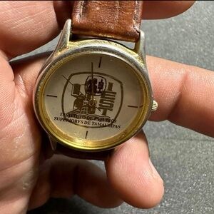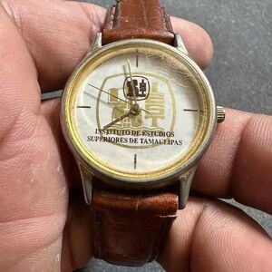 Vintage Instituto De Estudios Superiores De Tamaulipas Quarts Q&Q Watch Working shows signs of wear such as scratches on case and crystal as well as discoloration watch needs a new band see pictures for reference