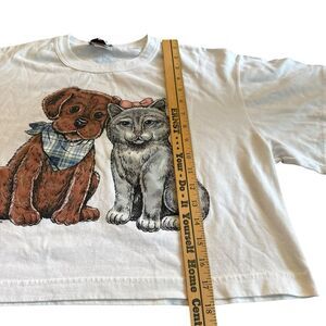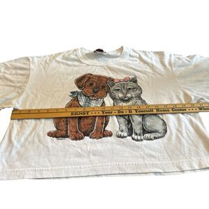 This product is a vintage t-shirt from the International Design Group featuring a small white design of a dog and cat on the front and back. The shirt is a regular women's size with short sleeves and a vintage feel. Perfect for those who appreciate unique and playful additions to their wardrobe.