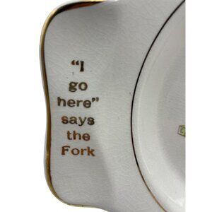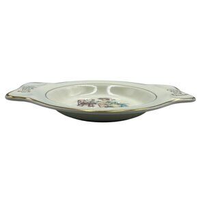This charming vintage baby dish features adorable artwork of a child feeding a teddy bear and gold-trimmed edges. Its unique handles display playful phrases, adding nostalgic appeal.