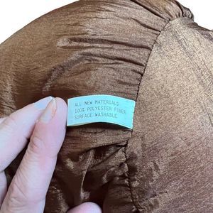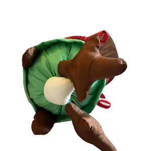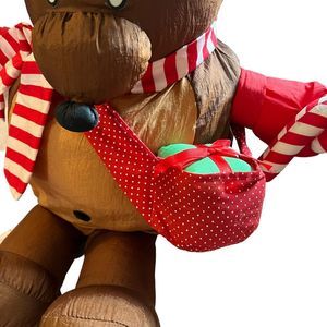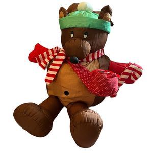 Item is pre-owned but I see no stains or holes etc. Item is 15 inches tall. He is wearing a hat and scarf and carrying a bag of presents.
