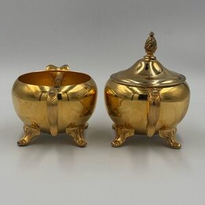 Stunning Vintage International Silver Company 24k Gold Plated Footed Creamer and Sugar Bowl Set with ornate handles and pineapple finial. Creamer measures approximately 5”x3” and sugar bowl is approximately 6”x5”. Has original manufacturer stickers on the bottom. In good condition.