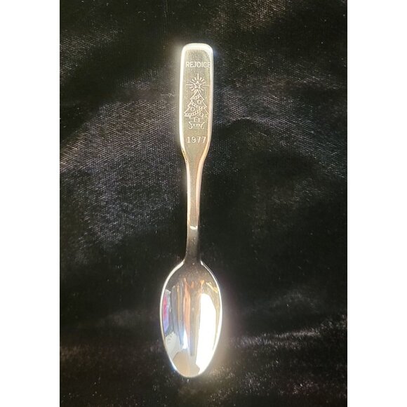 Vintage International Silver Company "Rejoice" Christmas Spoon, crafted of silverplate in 1977. Approximate measurements: 4.5 inches long, 0.75 inch wide. Please see the provided photos for further details.