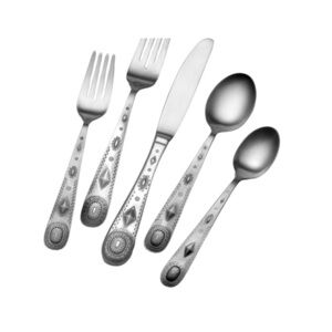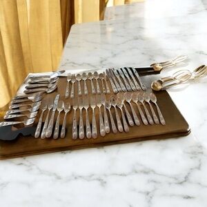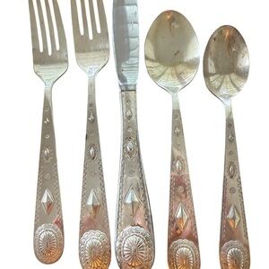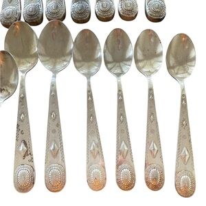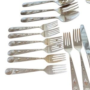 Purchased this set from HORCHOWS back in the early 90s. It has a unique southwestern look and 45 items are available. Some pieces have slight damage and three spoons have considerable damage. I believe they can be re-silvered. Here is a breakdown of what is included, but please note the photographs.